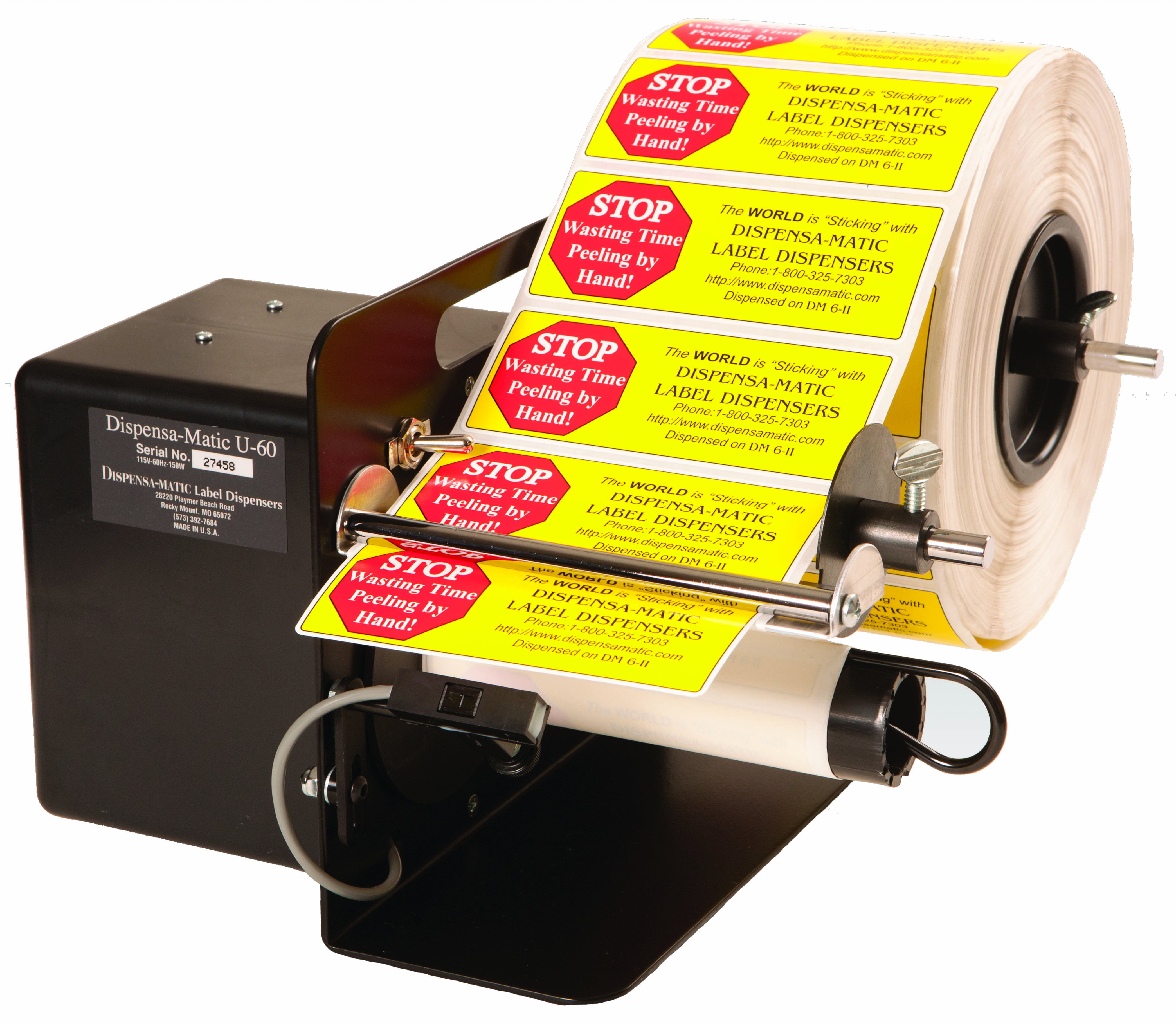 Dispensa-Matic U-60 Label Dispenser: Is a simple heavy-duty semi-automatic electric label dispenser that is designed for labels from 3/8 of an inch to 6 inch widths to any length tall. This label dispenser advances at over 7″ per second standard.